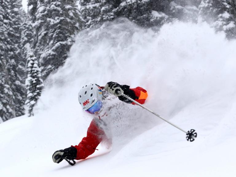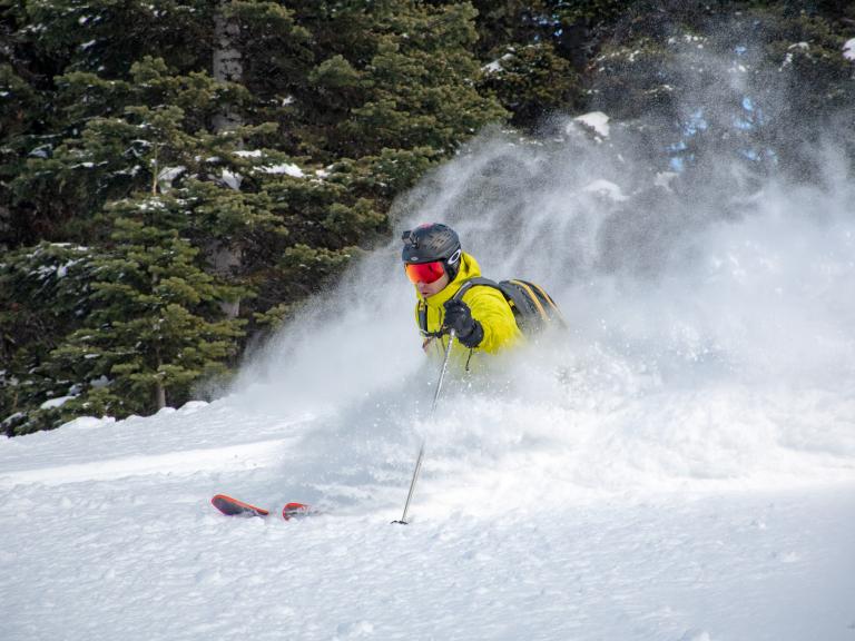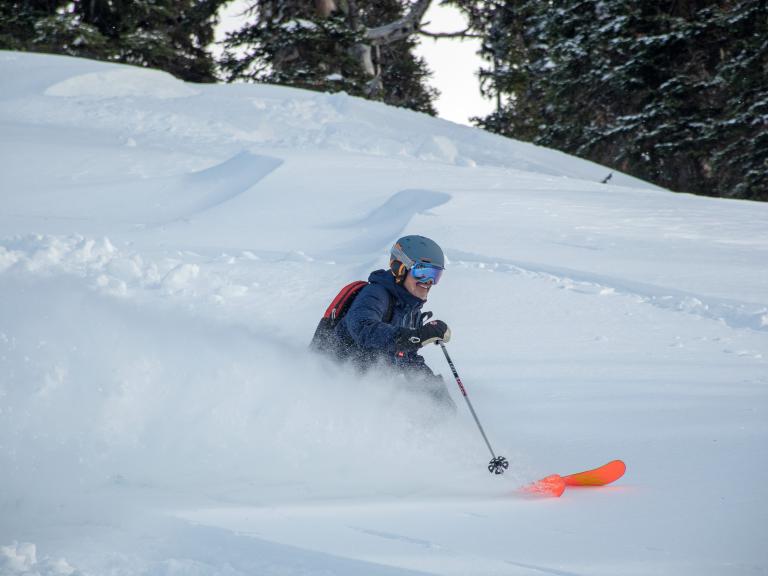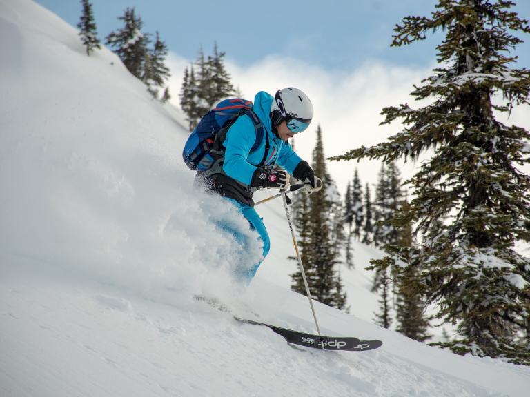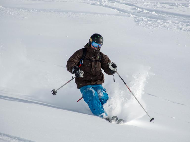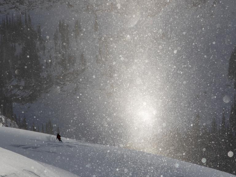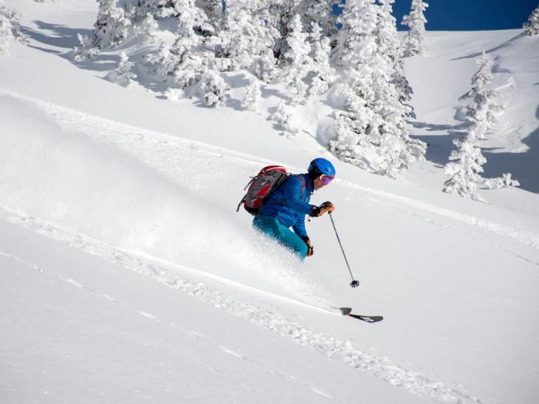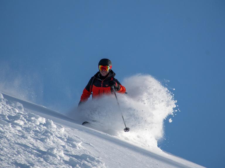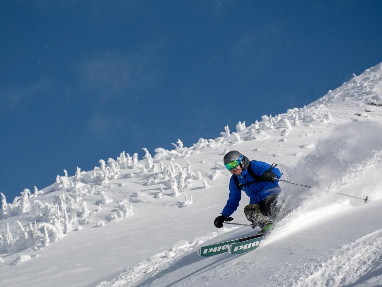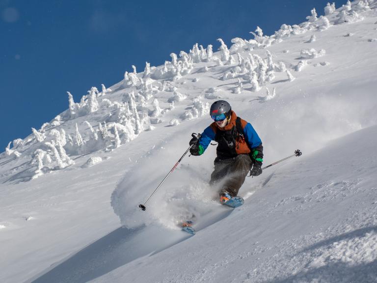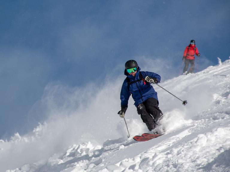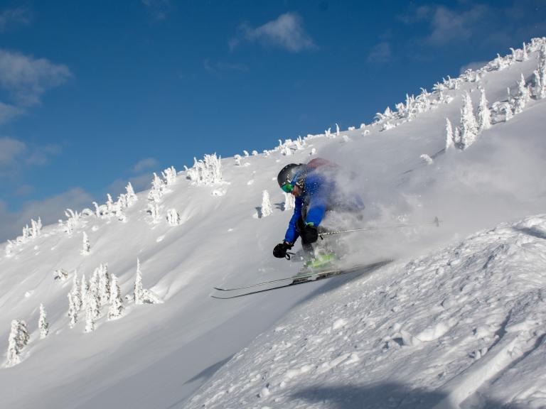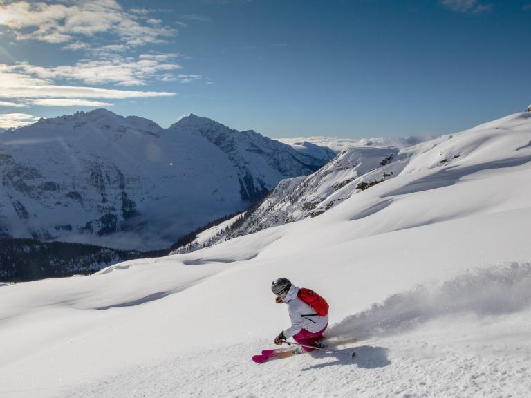Ballagner Bowl under blue sky and in low density champagne powder.